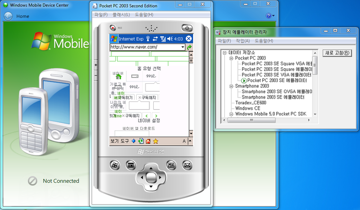 Visual Studio 2008 도구 - 장치 에뮬레이터 관리자 - Pocket PC 2003 SE 에뮬레이터 - 우측 마우스 버튼 클릭 - 연결 - 연결 완료후 크레들에 놓기하면 Window Moblie Device Center와 연결된다.