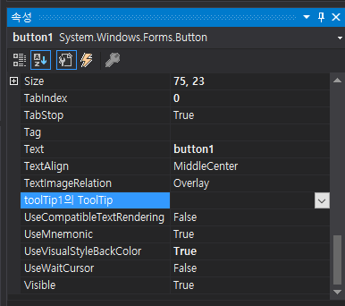 ๋ค๋ฅธ ์ปจํธ๋กค๋ค์ ๊ณตํต์ ์ผ๋ก tooltip1์ ToolTip ์ด๋ผ๋ ํ๋กํผํฐ๊ฐ ์๊ธด๋ค.